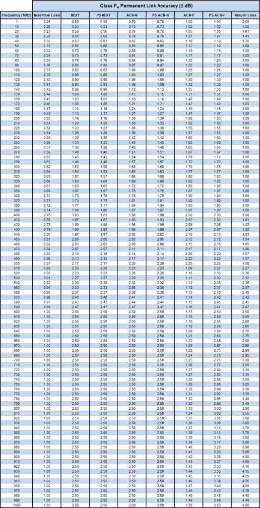 IEC 61935-1 Ed.4 requiere que el proveedor del equipo de prueba marque las mediciones basadas en frecuencia con un asterisco (*) si se encuentran dentro de la precisión nominal del equipo de prueba. La siguiente tabla detalla la precisión nominal del DSX-5000 CableAnalyzer para las mediciones de canal ISO/IEC 11801:2010 Edición 2,0 Clase FA de acuerdo con el Anexo A.3 de IEC 61935-1 Ed.4.