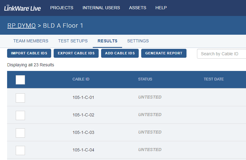A continuación, en la página RESULTADOS del proyecto o subproyecto, haga clic en el botón IMPORTAR IDENTIFICACIONES DE CABLES.