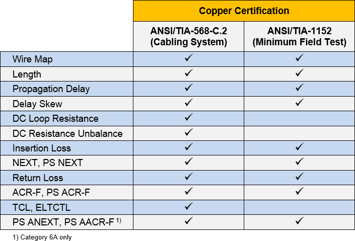 Solicite el Desequilibrio de resistencia de CC dentro de un par . Si bien es un requisito del estándar del sistema de cableado ANSI/TIA-568-C.2, no es una prueba de campo obligatoria en ANSI/TIA-1152, titulada Requisitos para instrumentos y medidas de prueba de campo para cableado de par trenzado balanceado. La siguiente tabla muestra cómo ciertas pruebas de campo están excluidas en ANSI/TIA-1152: