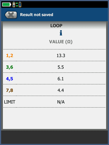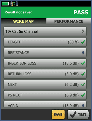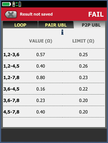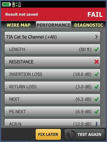 La falta de una clasificación PASA/FALLA para la resistencia de bucle de CC (mostrado anteriormente) es un resultado directo de que ANSI/TIA-1152 no requiere resistencia de bucle de CC como requisito. Lo bueno es que cuando ANSI/TIA-1152-A se publique, requerirá resistencia de bucle de CC para el cumplimiento. Sin embargo, incluso si el límite de 25 ohmios encontrado en ANSI/TIA-568-C.2 o ISO/IEC 11801 se aplicó a este enlace, aún pasaría, aunque tenga un problema de resistencia de contacto CC.