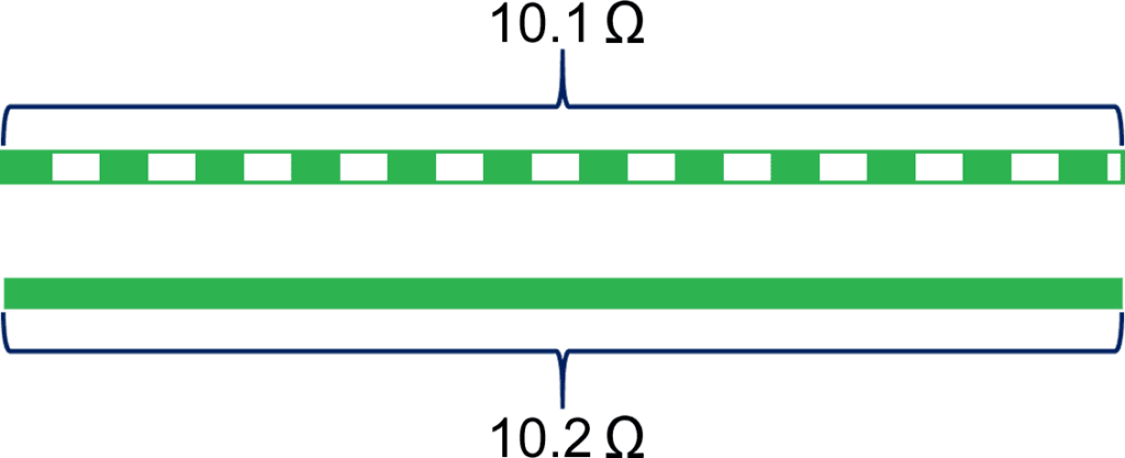 - Desequilibrio de resistencia de CC dentro de un par = |10,1 Ω a 10,2 Ω| = 0,1 Ω