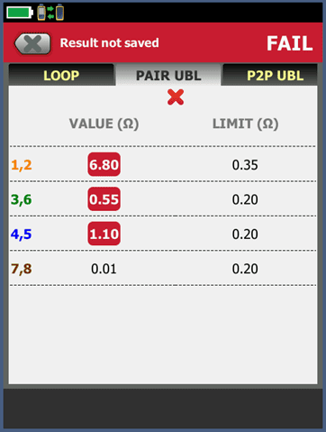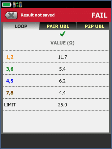 La comprobación de este enlace nuevamente para incluir el desequilibrio de resistencia de CC dentro de un par dio como resultado un ERROR. Para el técnico y el usuario final, está claro que algo anda mal con este enlace.