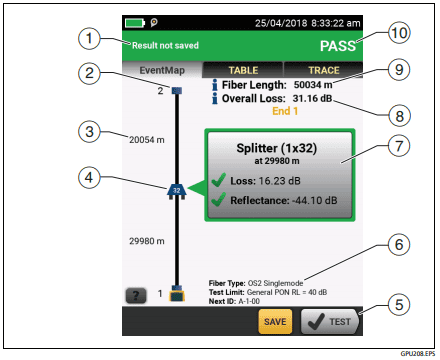 Haga clic aquí  para obtener explicaciones de los íconos en el mapa de eventos, los eventos de la tabla de eventos y las descripciones de eventos después de ejecutar una prueba PON OTDR con OptiFiber Pro HDR.